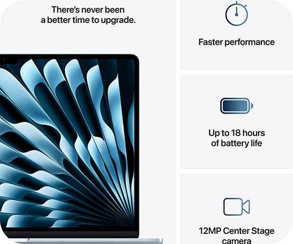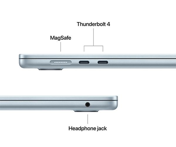 Το MacBook Air διαθέτει δύο θύρες Thunderbolt 4, θύρα φόρτισης MagSafe, υποδοχή ακουστικών, Wi-Fi 6E και Bluetooth 5.3. Και υποστηρίζει έως και δύο εξωτερικές οθόνες.