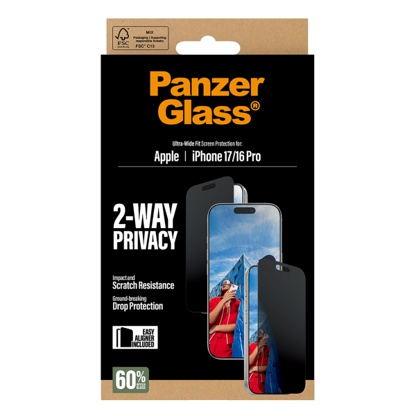 Με το γυαλί προστασίας οθόνης με πλαίσιο PANZERGLASS Ultra - Wide Fit 2-Way Privacy για iPhone 17/ 16 Pro, η οθόνη σου είναι ασφαλής όχι μόνο από γρατσουνιές και χτυπήματα, αλλά και από αδιάκριτα βλέμματα. Το ειδικά σχεδιασμένο φίλτρο απορρήτου κάνει το περιεχόμενο της οθόνης σου σχεδόν αόρατο για όλους γύρω σου, ενώ εσύ βλέπεις καθαρά κάθε λεπτομέρεια και κάθε εφαρμογή χωρίς περιορισμό.