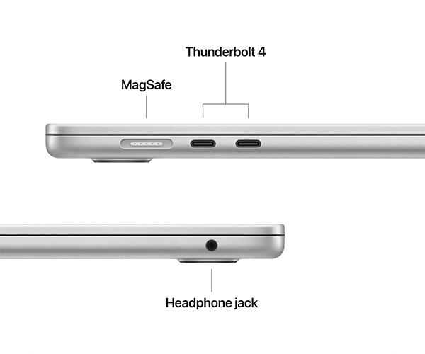 Το MacBook Air διαθέτει δύο θύρες Thunderbolt 4, θύρα φόρτισης MagSafe, υποδοχή ακουστικών, Wi-Fi 6E και Bluetooth 5.3. Και υποστηρίζει έως και δύο εξωτερικές οθόνες.