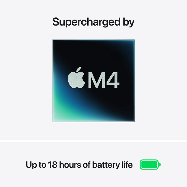 Το Apple M4 chip σού προσφέρει ακόμα περισσότερη ταχύτητα και ομαλή ροή σε όλα όσα κάνεις, όπως όταν εργάζεσαι ταυτόχρονα σε πολλά apps, επεξεργάζεσαι βίντεο ή παίζεις παιχνίδια με απαιτητικά γραφικά.