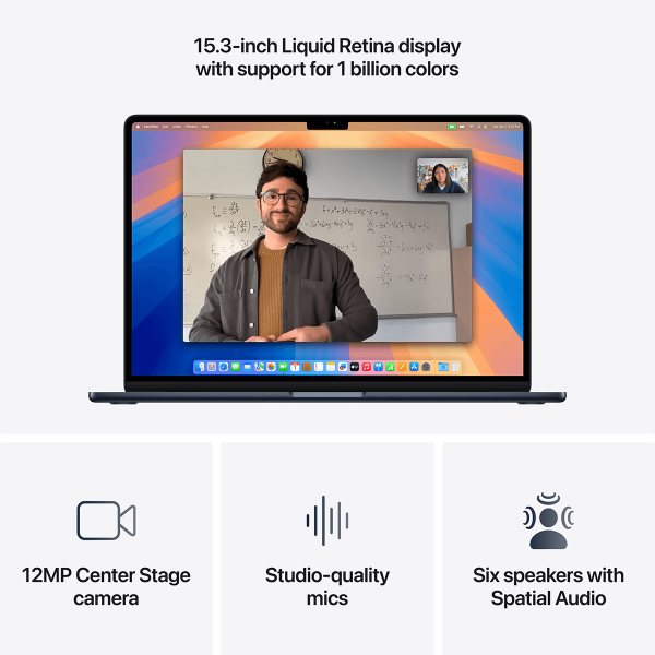 Η οθόνη Liquid Retina 15.3 ιντσών υποστηρίζει ένα δισεκατομμύριο χρώματα. Οι φωτογραφίες και τα βίντεο προβάλλονται με πλούσια αντίθεση και ευκρινείς λεπτομέρειες και το κείμενο εμφανίζεται με εξαιρετική ευκρίνεια.