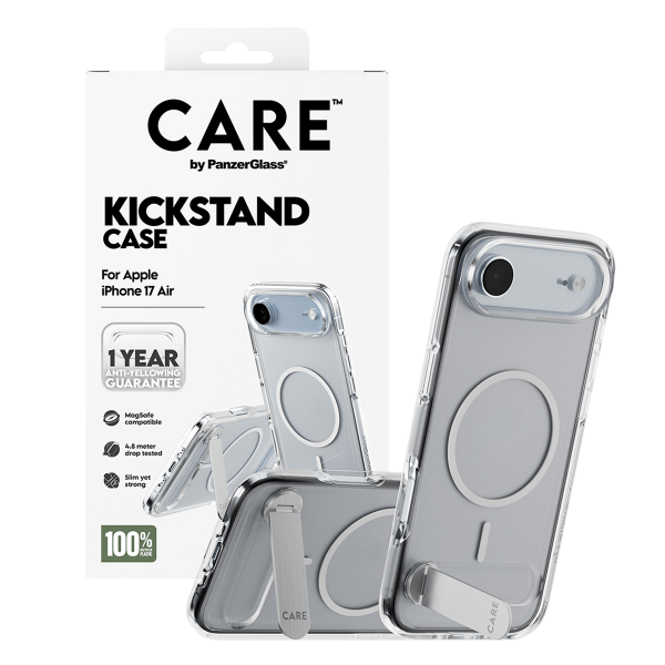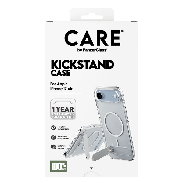 Η Kickstand  από τη σειρά CARE by PanzerGlass σχεδιάστηκε για να προστατεύει το iPhone Air σου σε κάθε πρόκληση της καθημερινότητας. Με ειδικά ενισχυμένες γωνίες που απορροφούν τους κραδασμούς για σιγουριά ακόμα και στις πιο απαιτητικές συνθήκες, διαθέτει πιστοποιημένη αντοχή σε πτώσεις έως 3,6 μέτρα.