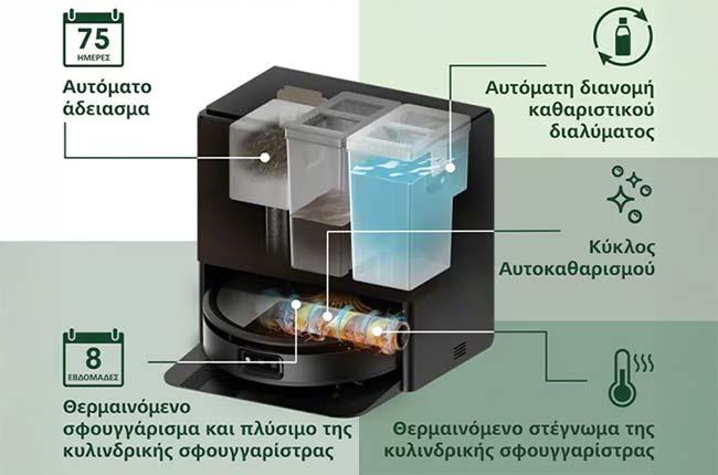 Η βάση AutoWash Dock αναλαμβάνει αυτόματο άδειασμα υπολειμμάτων έως 75 ημέρες, πλύσιμο σφουγγαρίστρας με θερμό νερό 72°C, στέγνωμα με θερμό αέρα 50°C και ανανέωση νερού για έως 8 εβδομάδες.