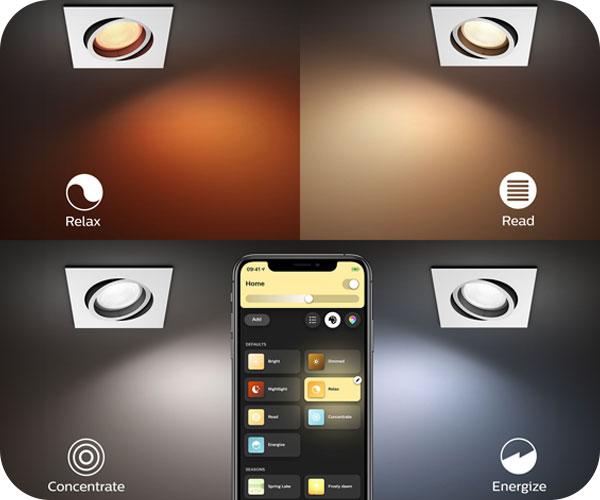 Εξερεύνησε τα 4 διαφορετικά σκηνικά φωτισμού που διαθέτει το PHILIPS hue white & color ambiance milliskin recessed έξυπνο σποτ 5.7W! Μπορείς να ξεκινήσεις τη μέρα σου με έντονο λευκό φως επιλέγοντας το Energize ή το Concentrate για τις ώρες συγκέντρωσης. Για στιγμές χαλάρωσης επέλεξε το απαλό και διακριτικό φως του Relax, αλλά αν πάλι θέλεις ένα πιο ήπιο φως για διάβασμα, η ιδανική επιλογή για εσένα, είναι η Read