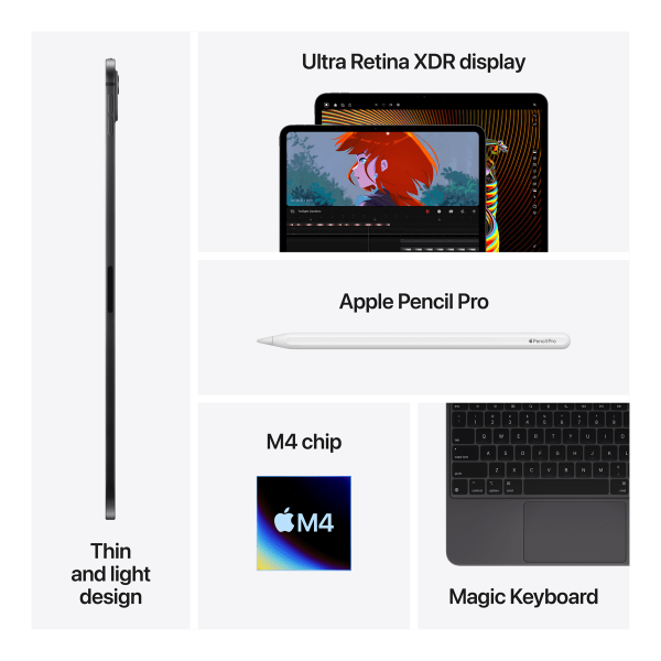 Το Apple Pencil Pro μεταμορφώνει το iPad Pro σε έναν καθηλωτικό καμβά ζωγραφικής και στην καλύτερη συσκευή λήψης σημειώσεων της Apple. Το Apple Pencil (USB-C) είναι επίσης συμβατό με το iPad Pro. Το Magic Keyboard για το iPad Pro έχει λεπτή και ελαφριά σχεδίαση, προσφέρει μια σπουδαία εμπειρία πληκτρολόγησης και μια ενσωματωμένη γυάλινη επιφάνεια αφής με απτική ανάδραση, ενώ παράλληλα λειτουργεί και ως προστατευτικό κάλυμμα για το iPad. Τα αξεσουάρ πωλούνται χωριστά.