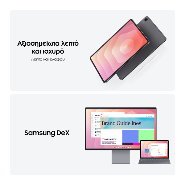 Το SAMSUNG Galaxy Tab S11 συνδυάζει κομψότητα και φορητότητα με πάχος μόλις 5,5 mm και βάρος 469 g, καθιστώντας το ιδανικό για μεταφορά και χρήση οπουδήποτε. Ο λεπτός και ελαφρύς σχεδιασμός του επιτρέπει άνετη κράτηση για μεγάλες περιόδους χρήσης, ενώ η στιβαρή κατασκευή εξασφαλίζει αντοχή και αξιοπιστία.
