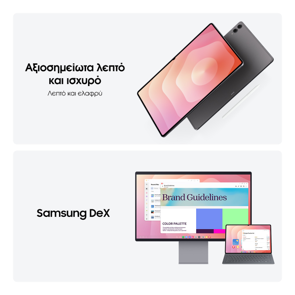 Το Tab S11 Ultra διαθέτει ultra λεπτό και ελαφρύ σώμα, που συνδυάζει κομψότητα και φορητότητα. Με πάχος μόλις λίγων χιλιοστών και βάρος κατάλληλο για καθημερινή χρήση, μπορείς να το πάρεις παντού μαζί σου χωρίς να αισθάνεσαι βάρος. Η μεταλλική κατασκευή και οι premium υφές προσδίδουν μοντέρνα αισθητική και ανθεκτικότητα.