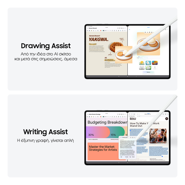 Ανακάλυψε μια μοναδική εμπειρία γραφής με το S Pen επόμενης γενιάς, που σου προσφέρει φυσική αίσθηση και απόλυτη ακρίβεια. Χρησιμοποίησέ το σαν εργαλείο για σημειώσεις, σχέδιο ή γρήγορες ιδέες, και απόλαυσε λειτουργίες όπως Quick Tools, Sticky Memo και το νέο Samsung DeX, που μεταμορφώνει το tablet σου σε ένα πλήρες περιβάλλον υπολογιστή για μέγιστη παραγωγικότητα.