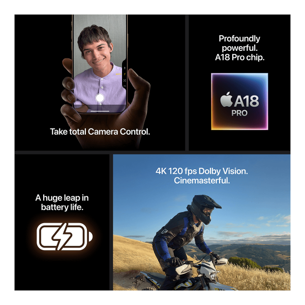 Το A18 Pro chip επιτρέπει προηγμένες λειτουργίες φωτογραφίας και βίντεο, όπως ο Έλεγχος Κάμερας, και προσφέρει εξαιρετική γραφική απόδοση για AAA παιχνίδια. Επιπλέον, το iPhone 16 Pro προσφέρει εξαιρετική απόδοση με έως και 27 ώρες αναπαραγωγής βίντεο και φόρτιση μέσω USB-C ή με MagSafe φορτιστή για ταχύτερη ασύρματη φόρτιση. Τέλος, ανέβασε τα βίντεό σου σε άλλο επίπεδο με 4K 120 fps Dolby Vision - χάρη στην κάμερα Fusion 48MP - και μικρόφωνα στούντιο για ηχογραφήσεις υψηλότερης ποιότητας. Έτσι, ένα επαγγελματικό στούντιο βρίσκεται στην τσέπη σου!